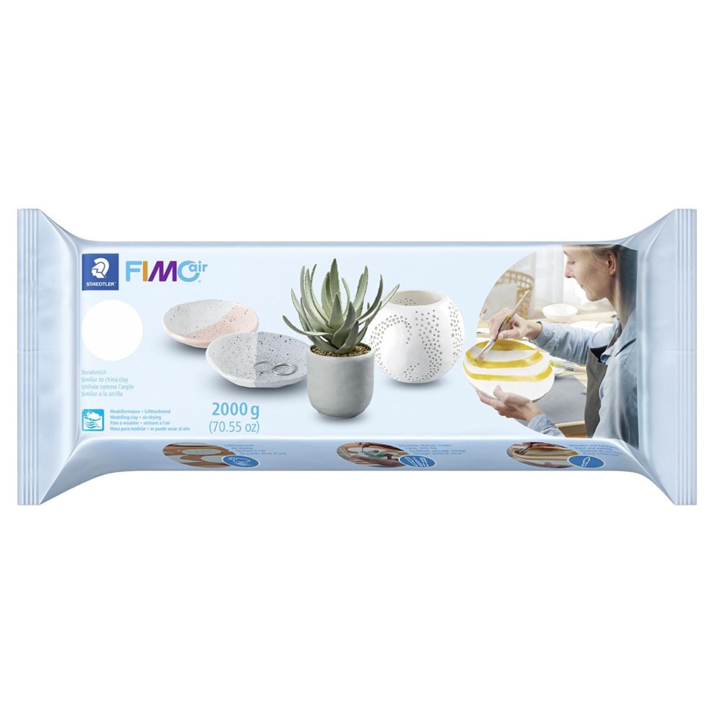 FIMO Basic Air je modelovacia hmota zo skupiny FIMO od výrobcu Staedler. Je to modelovací tmel na vodnej báze tvrdnúci na vzduchu, veľmi jemnej konzistencie. Vďaka jej mäkkej štruktúre z nej môžete vytvárať najrôznejšie tvary i jemné detaily. Po vybalení je hmota ihneď pripravená na modelovanie. Po skončení je nechajte vytvrdnúť voľne na vzduchu a potom ju môžete ďalej brúsiť, farbiť a dekorovať.